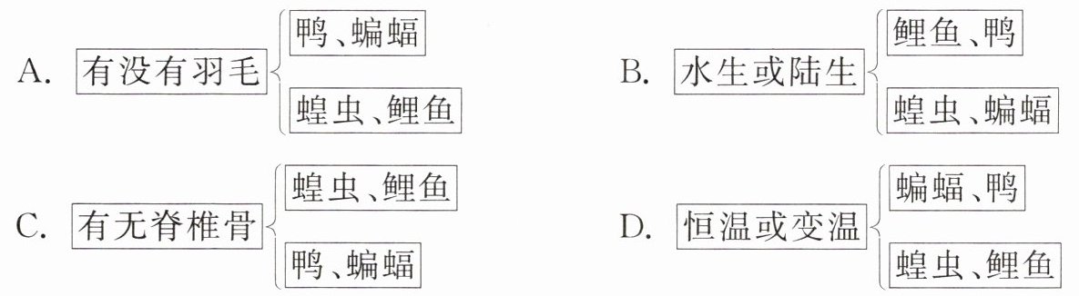 D.恒温或变温$\begin{cases} 蝙蝠、鸭 \\ 蝗虫、鲤鱼 \end{cases} $