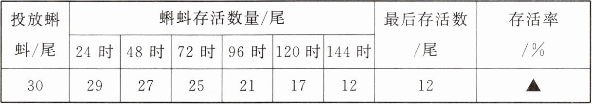 |投放蝌蚪/尾|蝌蚪存活数量/尾||||||最后存活数/尾|存活率/%|
