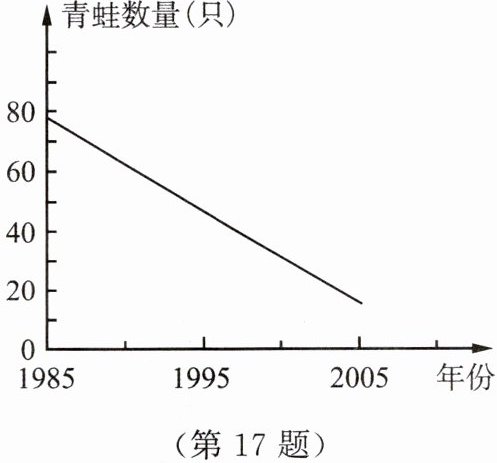 17. 某生物兴趣小组的同学为了研究环境对生物产生的影响,他们搜集了一些资料,根据当地政府的生物多样性报告,研究了1985~2005年间当地每亩稻田青蛙数量的变化。根据报告中的数据,绘制了如图所示的变化图线。