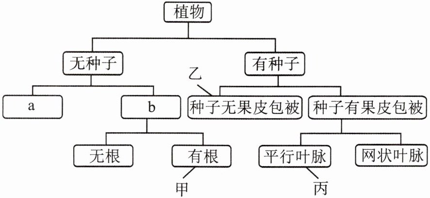 (3)小科在一次野外活动时,采集到甲、乙、丙3种植物,他通过观察标注了它们在检索表中的位置。这3种植物中,共同特征比较多的两种植物是______。