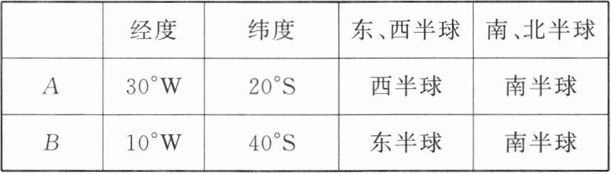 【思路点拨】 图中纬度的数值上小下大,说明A、B两地位于南半球。东、西半球是以西经20°和东经160°经线来判别的。