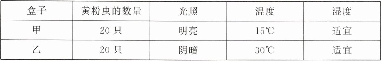 | 盒子 | 黄粉虫的数量 | 光照 | 温度 | 湿度 |