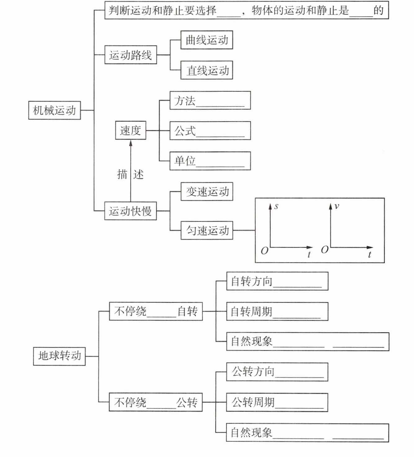 │ └─ 匀速运动→$\boxed{\begin{array}{c} s \\ \uparrow \\ O \rightarrow t \end{array} }$$\boxed{\begin{array}{c} v \\ \uparrow \\ O \rightarrow t \end{array} }$