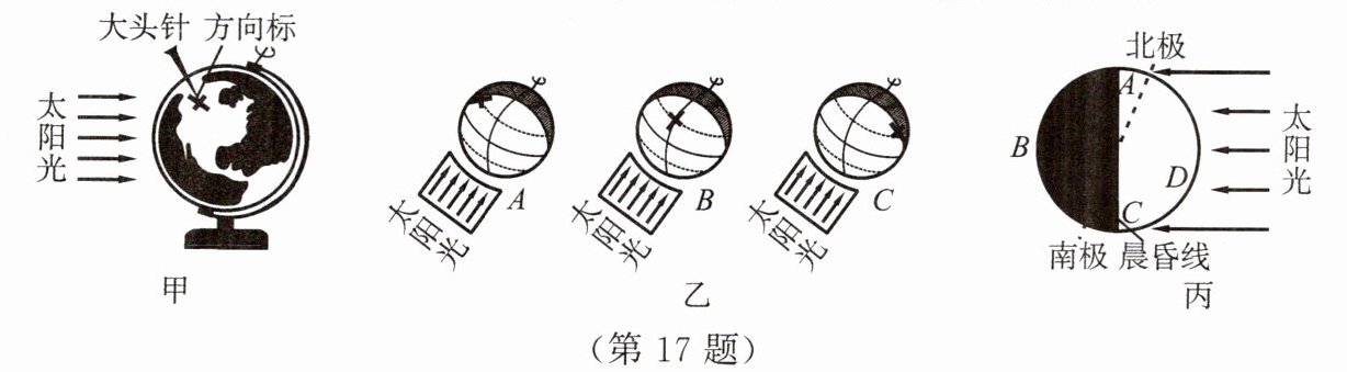 17. 小勇在做“地球的自转”的实验(如图甲)时,进行了如下操作:①剪一块白色纸板,在其上画平行的太阳光;②用硬纸板做一个十字方向标;③在地球仪上找到学校的大致位置,用大头针将十字方向标固定在该位置,并使方向标的方向与______一致;④按图示方向转动地球仪,观察太阳位置的变化;⑤观察并记录实验数据。
