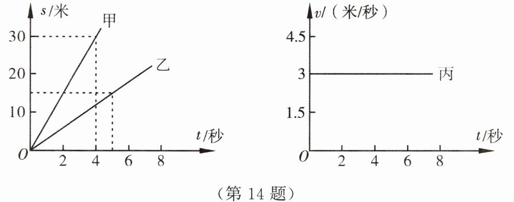 14. 甲、乙、丙三辆小车同时、同地向同一方向运动,运动的图像如图所示。由图像可知:运动速度相同的两车是______,做匀速直线运动的小车有______。