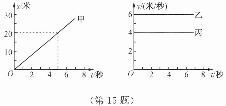 15. 甲、乙、丙三辆小车同时、同地向同一方向运动,它们运动的图像如图所示。运动速度相同的小车是______和______;经过5秒,跑在最前面的小车是______。