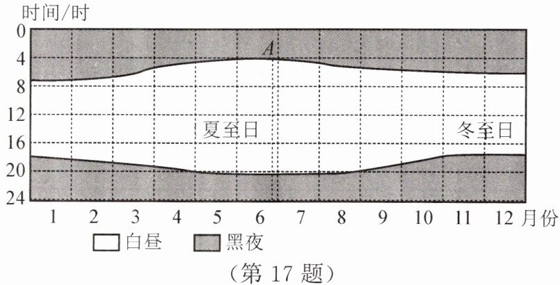 17. 如图所示为某地一年内的昼夜变化图。请据图回答下列问题: