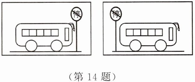 14. 如图所示,公共汽车在平直的公路上匀速行驶,用固定在路边的照相机连续两次对其拍照,两次拍照的时间间隔为2秒,车身长为12米,则这辆汽车的速度大约是______米/秒。这辆汽车在行驶时是以______为参照物的。