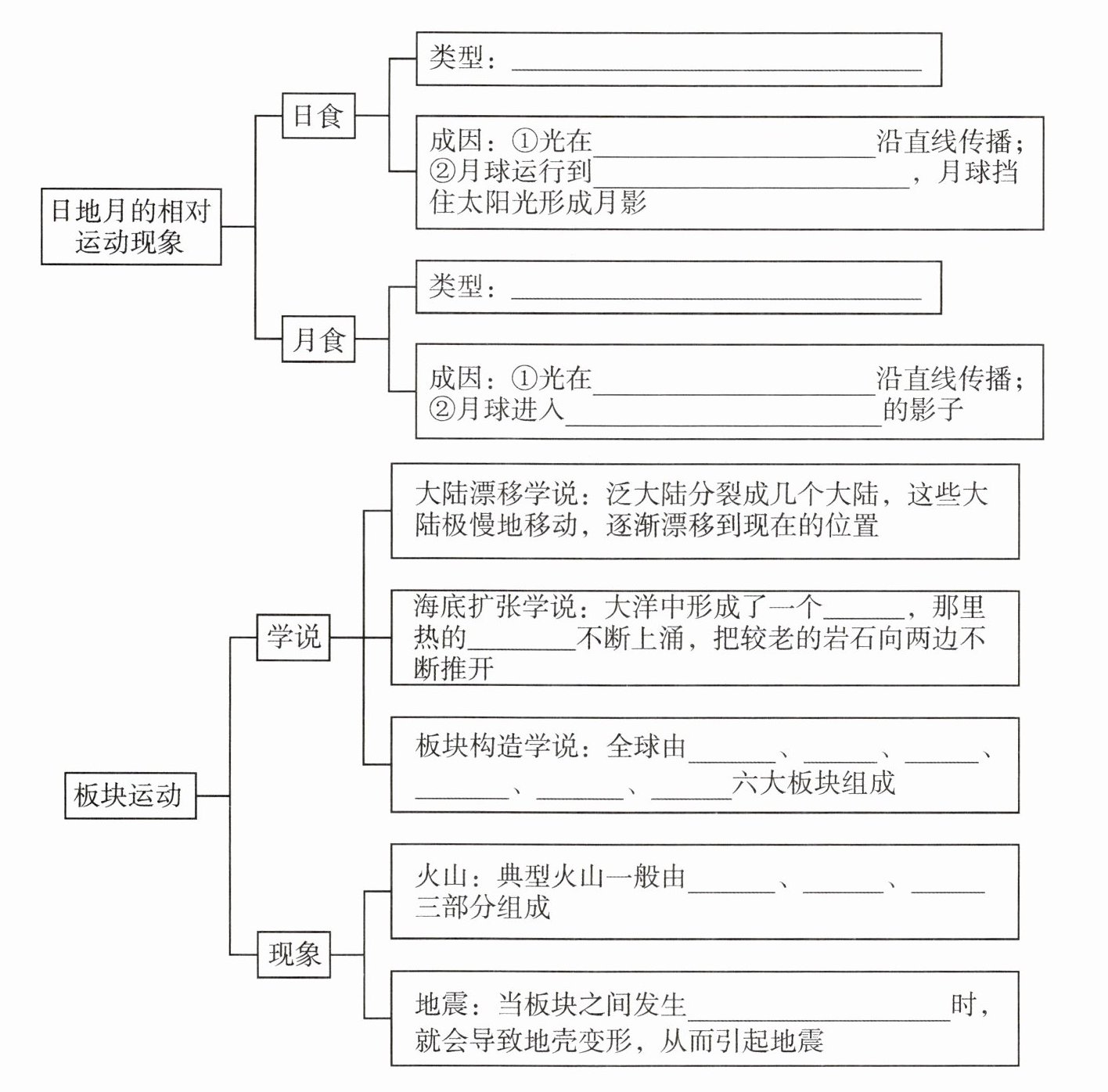 日环食、日偏食、日全食 同种均匀介质中 日地之间 月全食、月偏食 同种均匀介质中 地球 地壳裂缝(洋中脊) 熔岩物质 亚欧板块 美洲板块 非洲板块 印度洋板块 太平洋板块 南极洲板块 火山口 火山锥 岩浆通道 发生碰撞、挤压或错位时