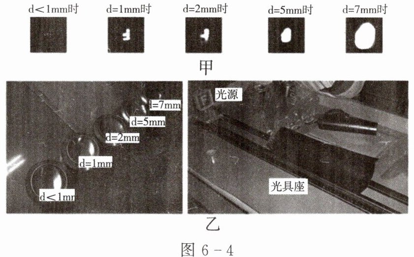 【变式】一组同学进行“小孔成像”的实验探究,在每个易拉罐的底部钻出大小不同的孔(d表示小孔直径),制作了5个小孔成像仪器,将光源和小孔成像器固定在光具座上,保持光源与小孔的距离不变,用5个小孔成像仪器分别观测,得到的像如图6-4甲所示,请你根据他们的实验过程和现象回答问题: