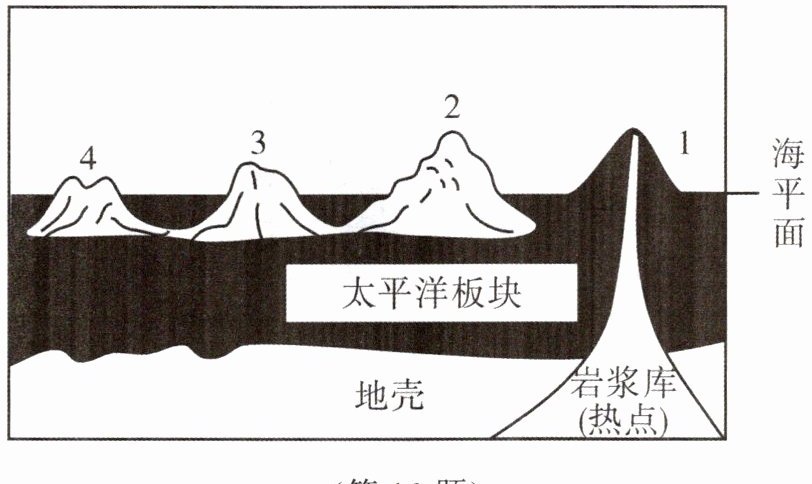 16. 地表的形态在持续的改变中。如图所示为夏威夷群岛的主岛(编号为1)与其三个链状火山岛屿(编号为2、3、4)的分布示意图,许多地质学家相信,夏威夷群岛的主岛和这些链状火山岛屿是由太平洋板块的“热点”上移喷发岩浆并凝固形成的。读图,回答下列问题: