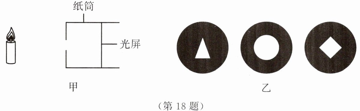 18. 某学习小组用如图甲所示的圆柱形纸筒做“探究小孔成像规律”的实验,发现像的大小不同,亮度也不一样。关于像的亮度与哪些因素有关,他们提出以下猜想: