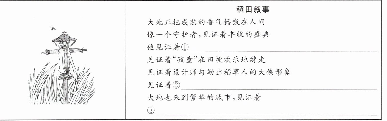 (1)经过几个晚上的思索,挥动画笔,“唰唰唰”,渐渐勾勒出一个潇洒不羁的稻草人大侠形象。