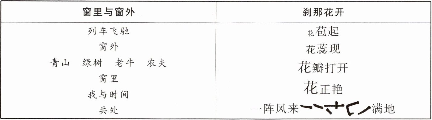 5.示例一:《窗里与窗外》利用文字模糊效果,营造出列车运动时,车外景物连续不断闪现的情形,表现时间的飞逝,很有创意。示例二:《刹那花开》“花”字由小变大,最终分解成零碎的笔画,表现出花儿被吹落枝头片片飞舞的效果,很有创意。