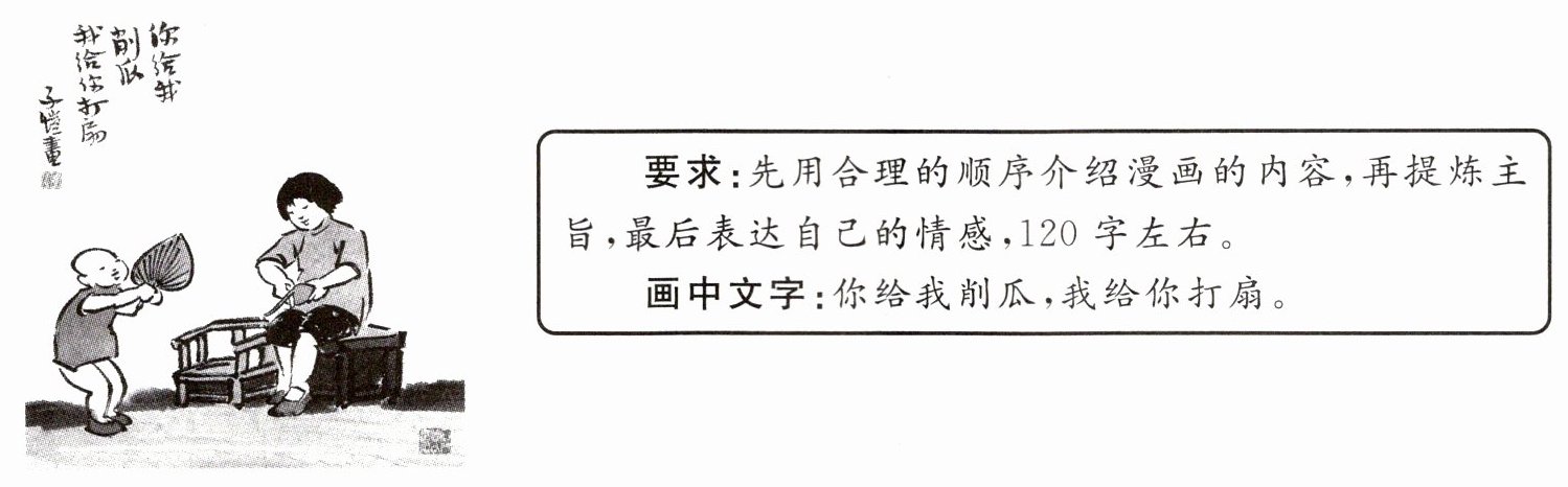 示例:漫画中画着一个母亲和一个孩子,母亲坐在凳子上微笑着给儿子削瓜,儿子双手拿着蒲扇在一旁给母亲扇风,漫画的左上角写着“你给我削瓜,我给你打扇”,整幅漫画母慈子孝、其乐融融。感恩母亲,总把好吃的留给我们,让我们也用实际行动回报母亲,让她感到幸福。