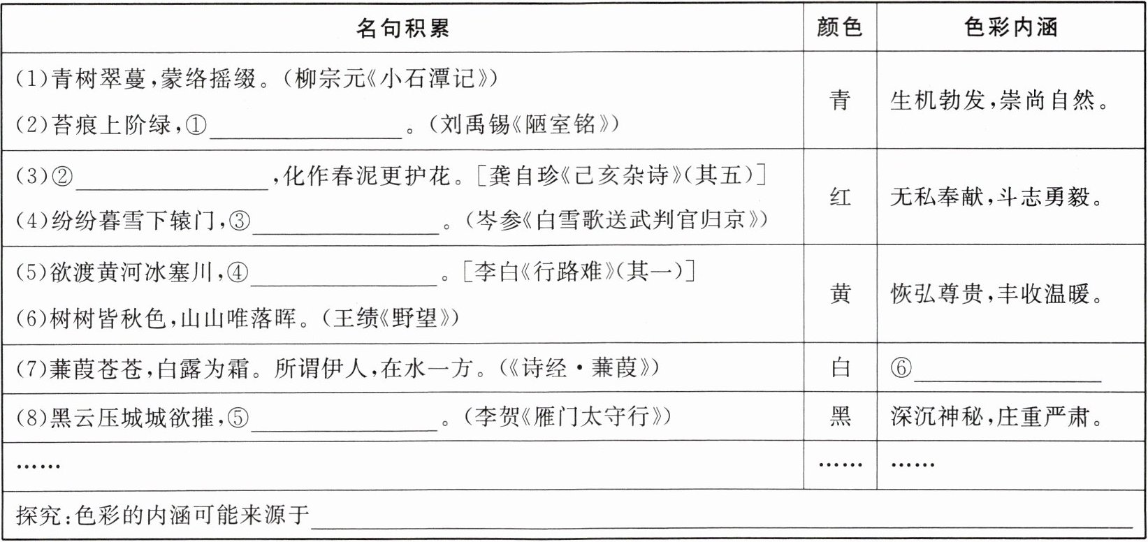 2.①草色入帘青 ②落红不是无情物 ③风掣红旗冻不翻 ④将登太行雪满山 ⑤甲光向日金鳞开 ⑥示例:纯洁无瑕,和平美好 3.来源于该种颜色事物的自然特质,如青绿代表生机;来源于诗歌意象,如白露、黑云等;来源于长期的文化特质赋予,如红色代表牺牲、奉献等。(意思基本符合即可)