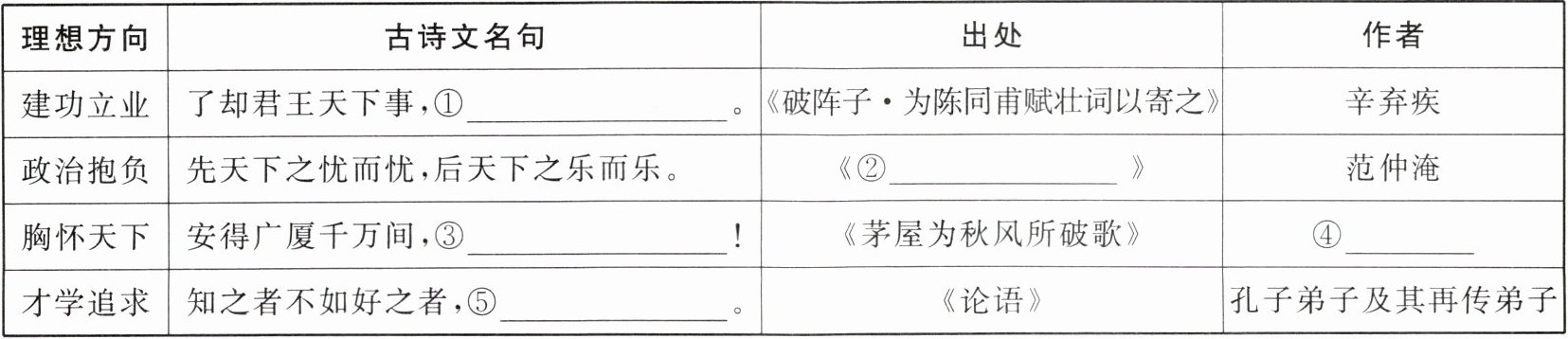 | 政治抱负 | 先天下之忧而忧,后天下之乐而乐。 | 《②______》 | 范仲淹 |