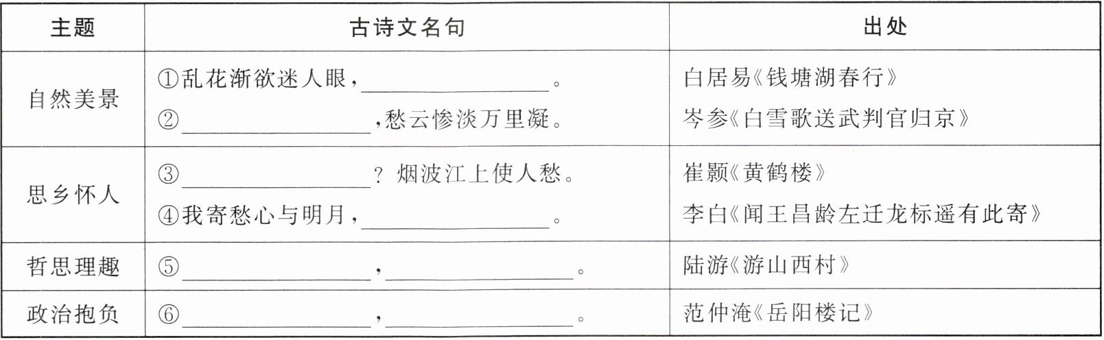 ①浅草才能没马蹄 ②瀚海阑干百丈冰 ③日暮乡关何处是 ④随君直到夜郎西 ⑤山重水复疑无路 柳暗花明又一村 ⑥先天下之忧而忧 后天下之乐而乐