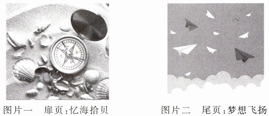 17.示例一:我选图片一。这张图片上画了一片沙滩、沙滩上的许多贝壳以及指南针。贝壳象征着同学们各种各样的美好回忆,指南针象征着为我们指引方向的老师。将这张图作为扉页,可以体现出毕业手册中记载了初中三年师生之间的美好回忆。