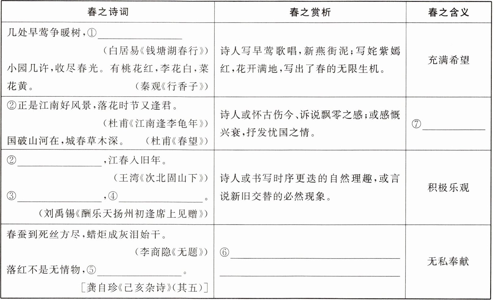 |②正是江南好风景,落花时节又逢君。(杜甫《江南逢李龟年》)国破山河在,城春草木深。(杜甫《春望》)|诗人或怀古伤今、诉说飘零之感;或感慨兴衰,抒发忧国之情。|⑦______|