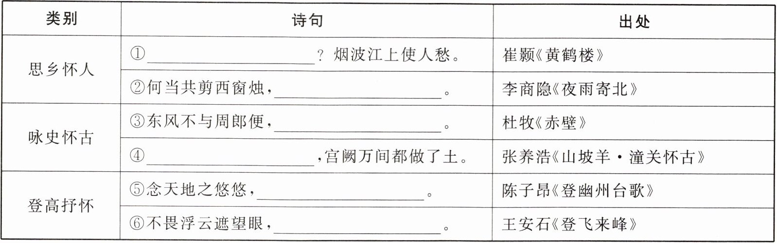 |思乡怀人|①______?烟波江上使人愁。|崔颢《黄鹤楼》|