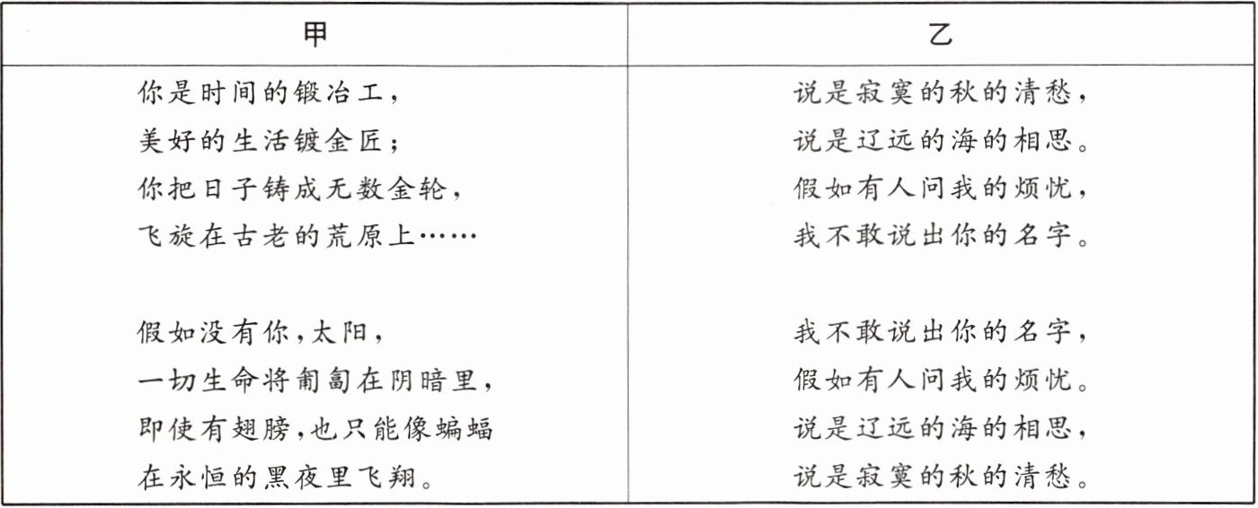 5.甲。艾青诗歌中常选择“太阳”这一意象,来表达对光明、美好的向往与追求,甲诗中不止一次出现“太阳”这一意象;艾青诗歌的语言呈现口语化、散文化的特点,形式上不讲究对称整齐,如字数、行数等,而乙诗整齐工整,与其风格不符。(一个角度2 分,选择两个角度回答即满分,其他角度言之有理也可)