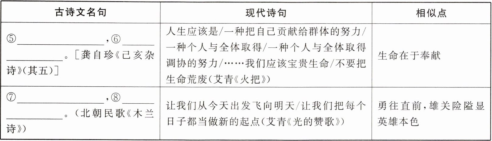 | ⑤______,⑥______。[龚自珍《己亥杂诗》(其五)] | 人生应该是/一种把自己贡献给群体的努力/一种个人与全体取得/一种个人与全体取得调协的努力/……我们应该宝贵生命/不要把生命荒废(艾青《火把》) | 生命在于奉献 |
