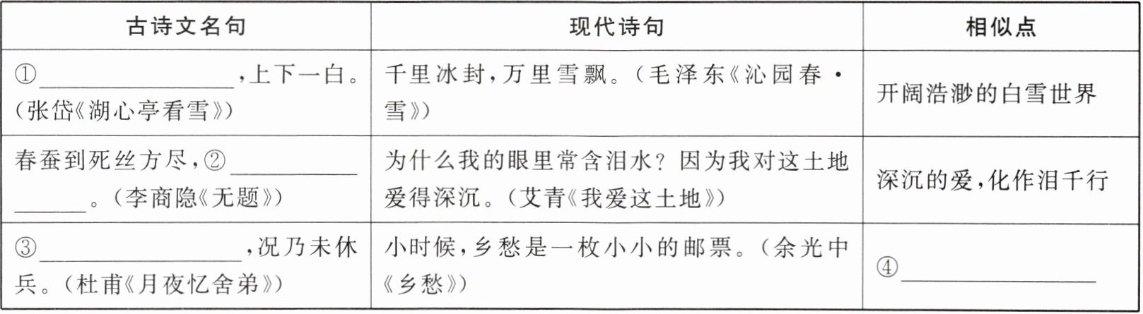 | ③______,况乃未休兵。(杜甫《月夜忆舍弟》) | 小时候,乡愁是一枚小小的邮票。(余光中《乡愁》) | ④______ |