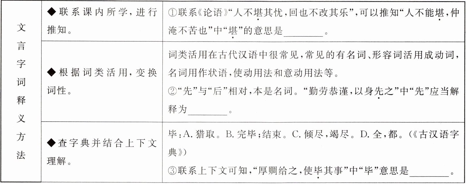 | 联系课内所学,进行推知。 | ①联系《论语》“人不堪其忧,回也不改其乐”,可以推知“人不能堪,仲淹不苦也”中“堪”的意思是______。 |