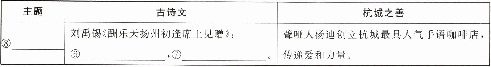 | ⑧______ | 刘禹锡《酬乐天扬州初逢席上见赠》:⑥______,⑦______。 | 聋哑人杨迪创立杭城最具人气手语咖啡店,传递爱和力量。 |