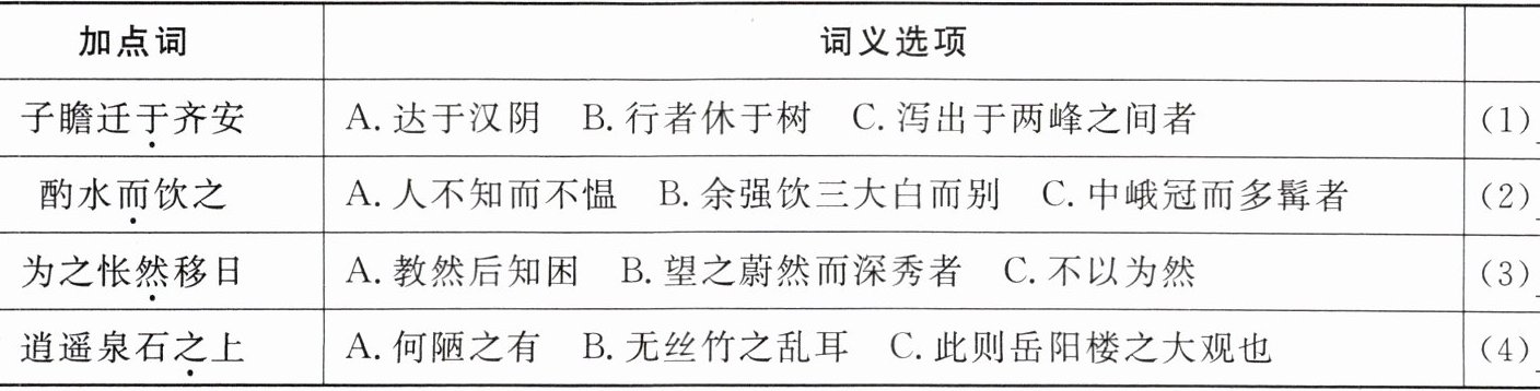 | 为之怅然移日 | A.教然后知困 B.望之蔚然而深秀者 C.不以为然 | (3)______ |