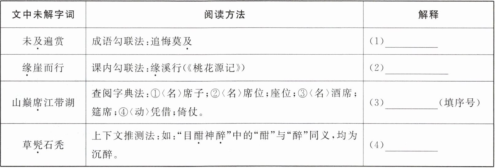 | 草髡石秃 | 上下文推测法:如“目酣神醉”中的“酣”与“醉”同义,均为沉醉。 | (4)______ |