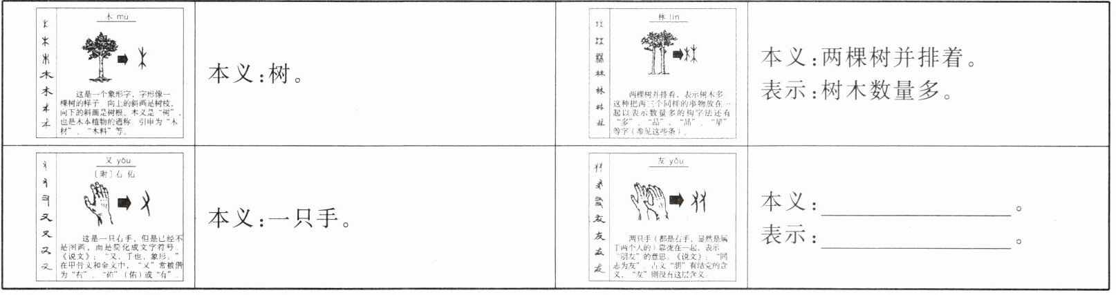 | | 本义:一只手。 | | 本义:______。表示:______。 |