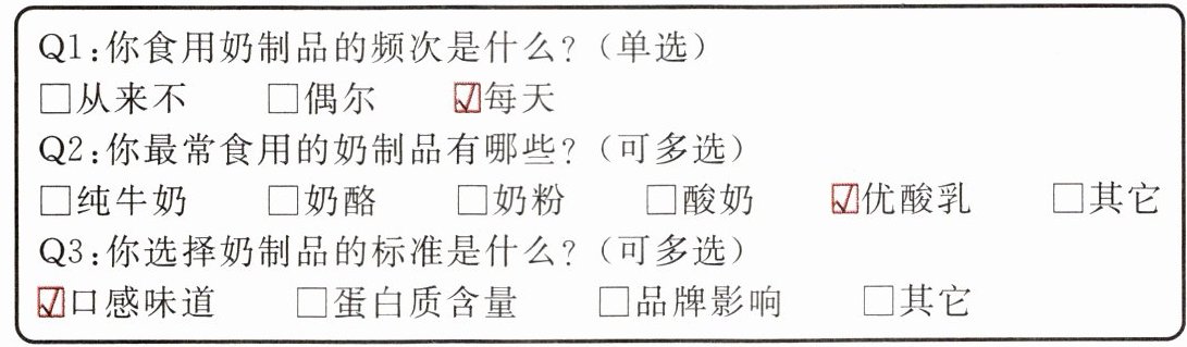 □纯牛奶 □奶酪 □奶粉 □酸奶 ☑优酸乳 □其它