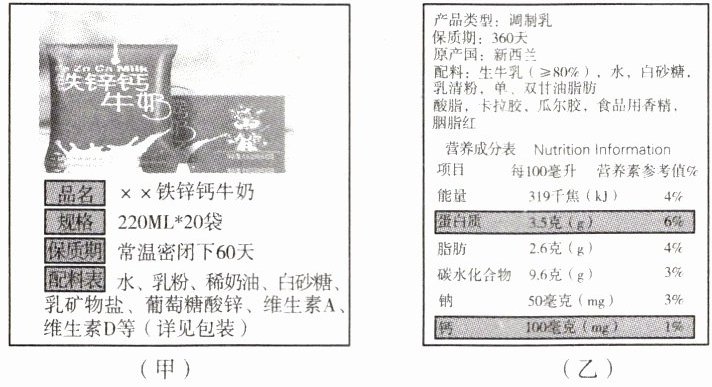 10.乙款牛奶达到“学生饮用奶”标准。理由:乙款是调制乳,配料中生牛乳≥80%,符合调制乳定义;其蛋白质含量为3.5克/100毫升,高于学生饮用奶调制乳标准中蛋白质2.4 克/100 毫升的要求 。甲款牛奶未达到“学生饮用奶”标准。理由:甲款配料表第一位是水,不是奶,属于乳饮料,不符合学生饮用奶标准。