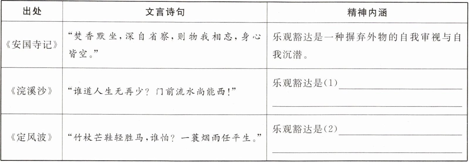 | 《定风波》 | “竹杖芒鞋轻胜马,谁怕?一蓑烟雨任平生。” | 乐观豁达是(2)______ |