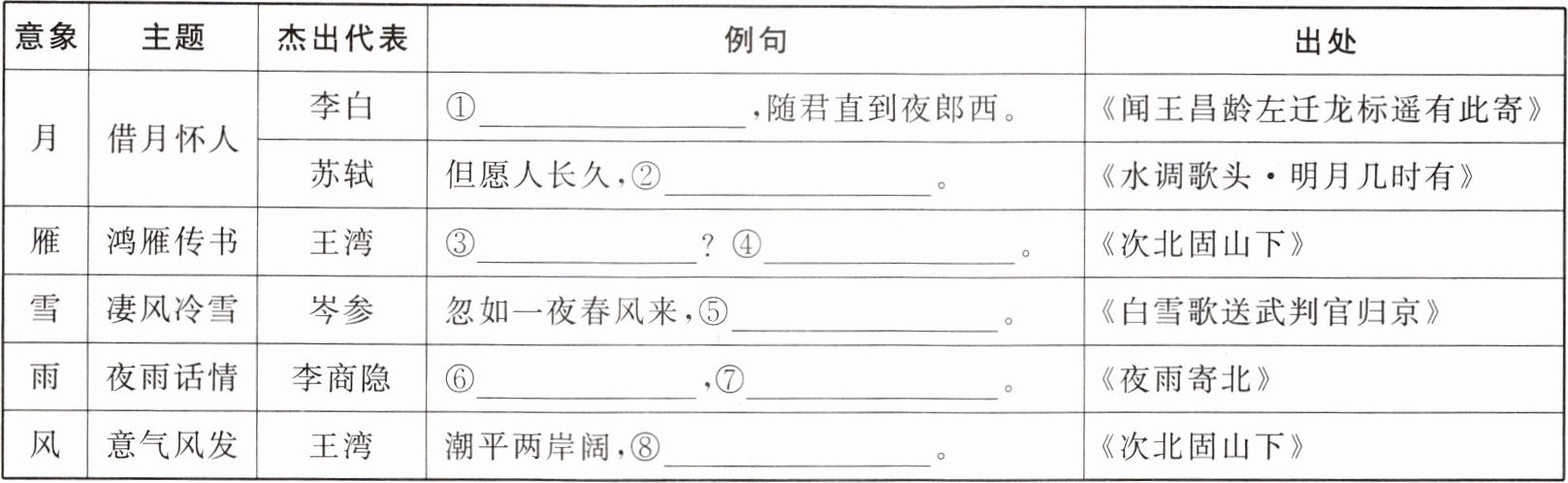 | 月 | 借月怀人 | 李白 | ①______,随君直到夜郎西。 | 《闻王昌龄左迁龙标遥有此寄》 |