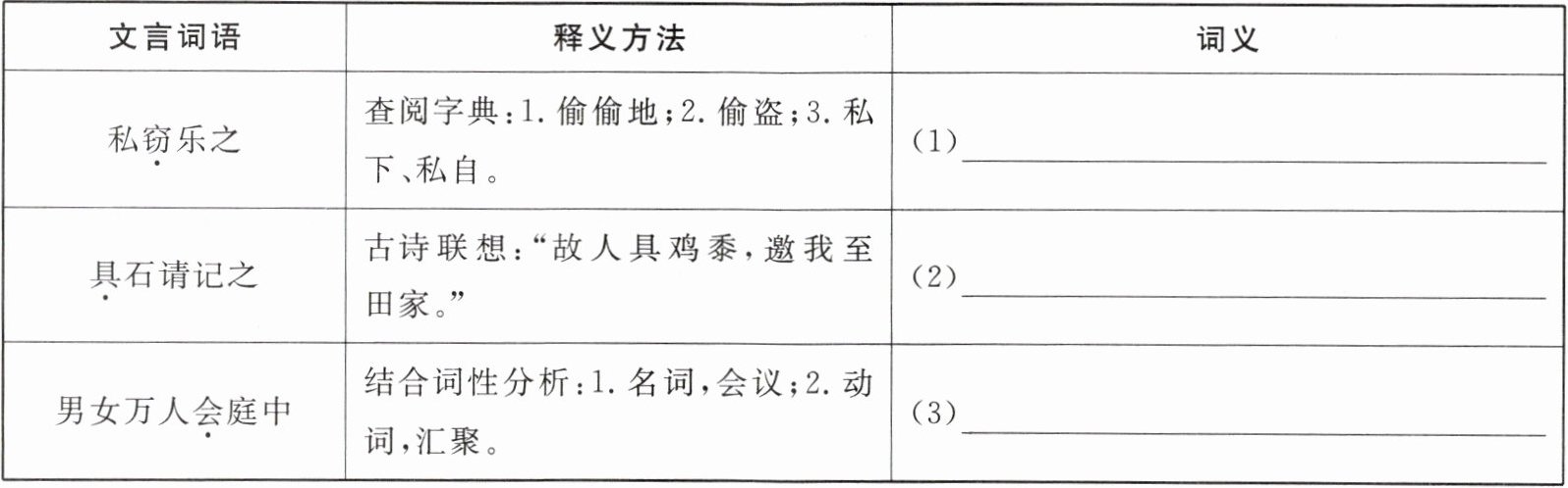 | 私窃乐之 | 查阅字典:1.偷偷地;2.偷盗;3.私下、私自。 | (1)______ |