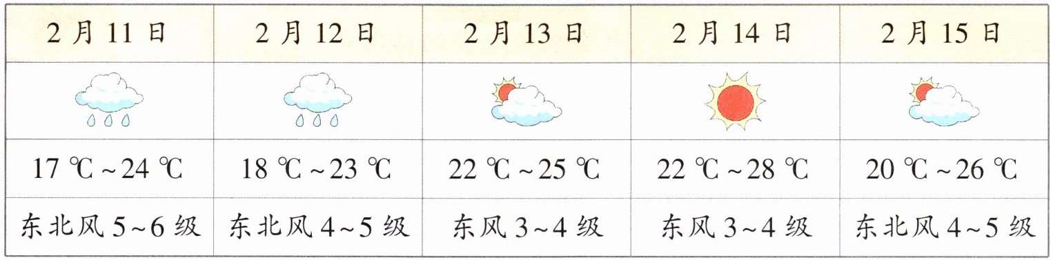 6 新情境 (杭州萧山区期末)小科一家计划寒假期间去海南三亚旅游,下面是三亚未来五天的天气预报。