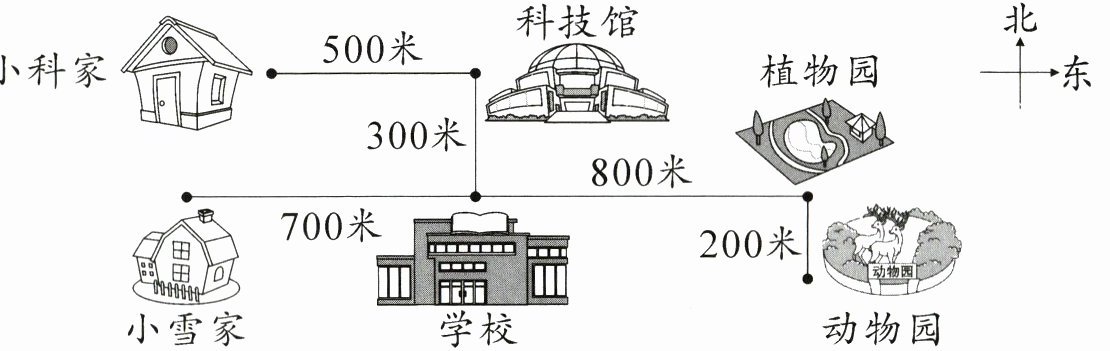 (1)学校在小雪家的______边,科技馆在学校的______边。(均填方向)