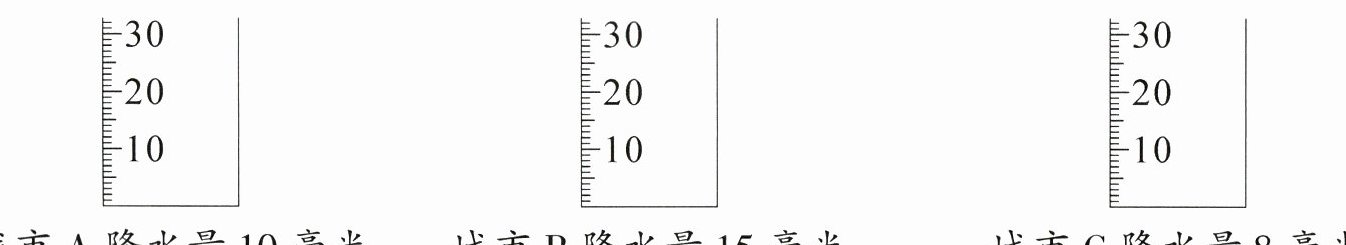 (5) 请根据提供的降水量,把下列雨量器中对应降水量的液柱区域涂黑。(6分)