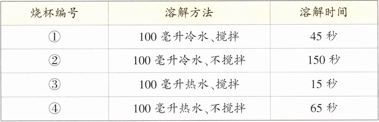 (3)还与食盐颗粒大小有关。分别把15克大颗粒的食盐和细颗粒的食盐倒入两个烧杯中,各加入100毫升热水并搅拌,比较食盐溶解的时间。(合理即可)