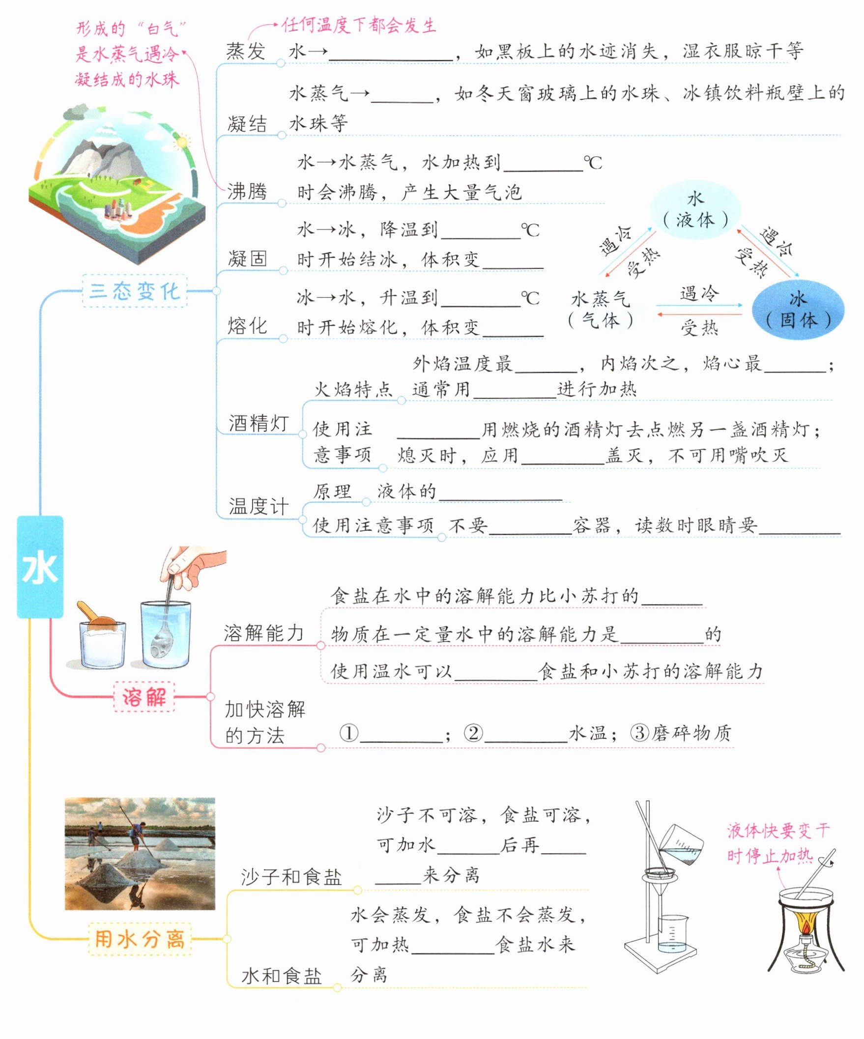 形成的“白气”是水蒸气遇冷凝结成的水珠三态变化蒸发任何温度下都会发生水→______,如黑板上的水迹消失,湿衣服晾干等凝结水蒸气→______,如冬天窗玻璃上的水珠、冰镇饮料瓶壁上的水珠等沸腾水→水蒸气,水加热到______℃时会沸腾,产生大量气泡凝固水→冰,降温到______℃时开始结冰,体积变______熔化冰→水,升温到______℃时开始熔化,体积变______酒精灯火焰特点外焰温度最______,内焰次之,焰心最______;通常用______进行加热使用注意事项______用燃烧的酒精灯去点燃另一盏酒精灯;熄灭时,应用______盖灭,不可用嘴吹灭温度计原理液体的______使用注意事项不要______容器,读数时眼睛要______溶解溶解能力食盐在水中的溶解能力比小苏打的______物质在一定量水中的溶解能力是______的使用温水可以______食盐和小苏打的溶解能力加快溶解的方法①______;②______水温;③磨碎物质用水分离沙子和食盐水沙子不可溶,食盐可溶,可加水______后再______来分离水和食盐水会蒸发,食盐不会蒸发,可加热______食盐水来分离