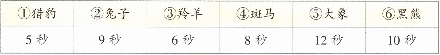 5 动物王国举行了100米赛跑,下表是各位参赛动物的成绩。