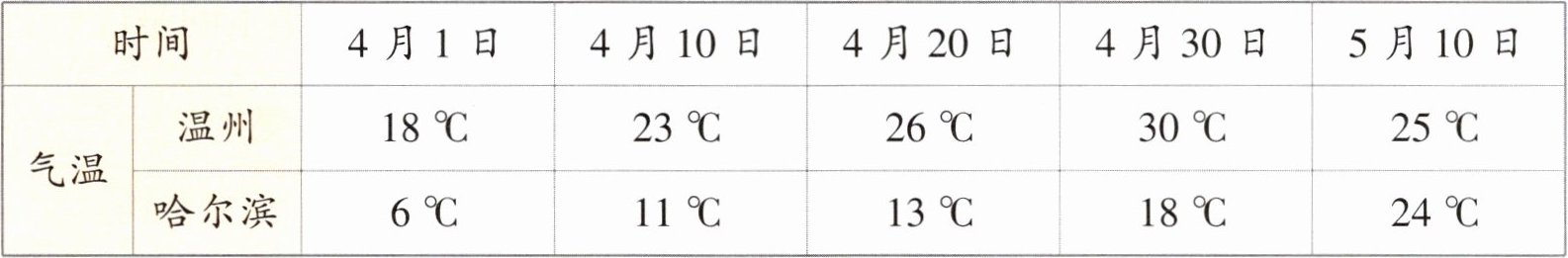 (2)4月份温州和哈尔滨的气温都在逐渐升高