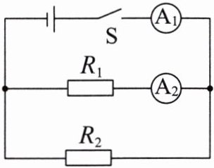 3. 将阻值为 10 Ω 的电阻 $ R_1 $ 与另一电阻 $ R_2 $ 接入电源电压恒定的电路,如图所示。闭合开关 S,电流表 $ A_1 $ 的示数为 0.45 A,电流表 $ A_2 $ 的示数为 0.3 A。则通过 $ R_2 $ 的电流为