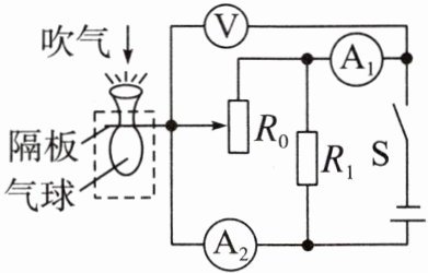 4. (2024·四川德阳中考)2024 年 3 月,德阳市青少年科技创新代表队在第 38 届四川省青少年科技创新大赛中取得优异成绩。下图是本次大赛德阳市青少年科技创新小组自制的肺活量比较装置,通过观察电流表示数的变化即可比较肺活量的大小。$ R_0 $ 为滑动变阻器,$ R_1 $ 为定值电阻,电压表、电流表为理想电表,电源电压保持不变。现闭合开关 S,科技创新小组成员向装置吹气,隔板向上平移,滑动变阻器 $ R_0 $ 接入电路的阻值变小,下列说法正确的是(