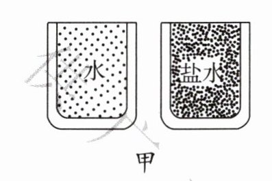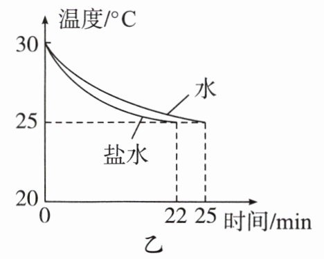 (3)如图甲所示,用两个同样的保温杯分别装满水和盐水,水和盐水的温度都是$30^{\circ}C$,周围环境温度保持$20^{\circ}C$不变,保温杯敞开口,水和盐水的温度随时间变化的图像如图乙所示(温度低于$25^{\circ}C$的图像未画出)。由图乙可知,降低相同的温度时,杯中盐水与水放出的热量之比为
