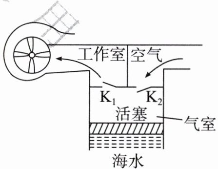 9. 右图是世界上第一盏海浪发电航标灯的气室示意图,其工作原理为:当海浪向下运动时,带动活塞向下运动,阀门$K_1$闭合$,K_2$打开,将空气吸入气室;之后海浪推动活塞向上运动,压缩空气到一定程度后,阀门$K_1$打开$,K_2$闭合,将气室内的空气推入工作室,推动工作室中的涡轮机运转,并带动发电机发电。对于此过程,下列说法正确的是(