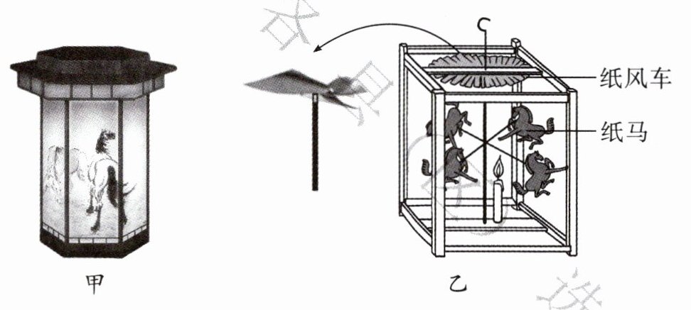 8. 早在八百多年前,我国就发明了流行于民间的走马灯,如图甲所示。如图乙所示,点燃走马灯内的蜡烛,纸筒内部的